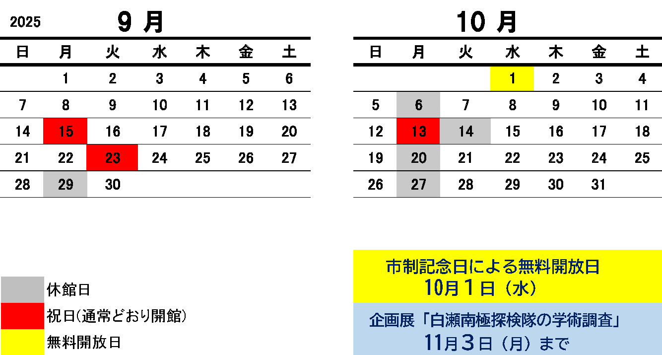 2025年9月-10月の開館カレンダー(8月29日更新)